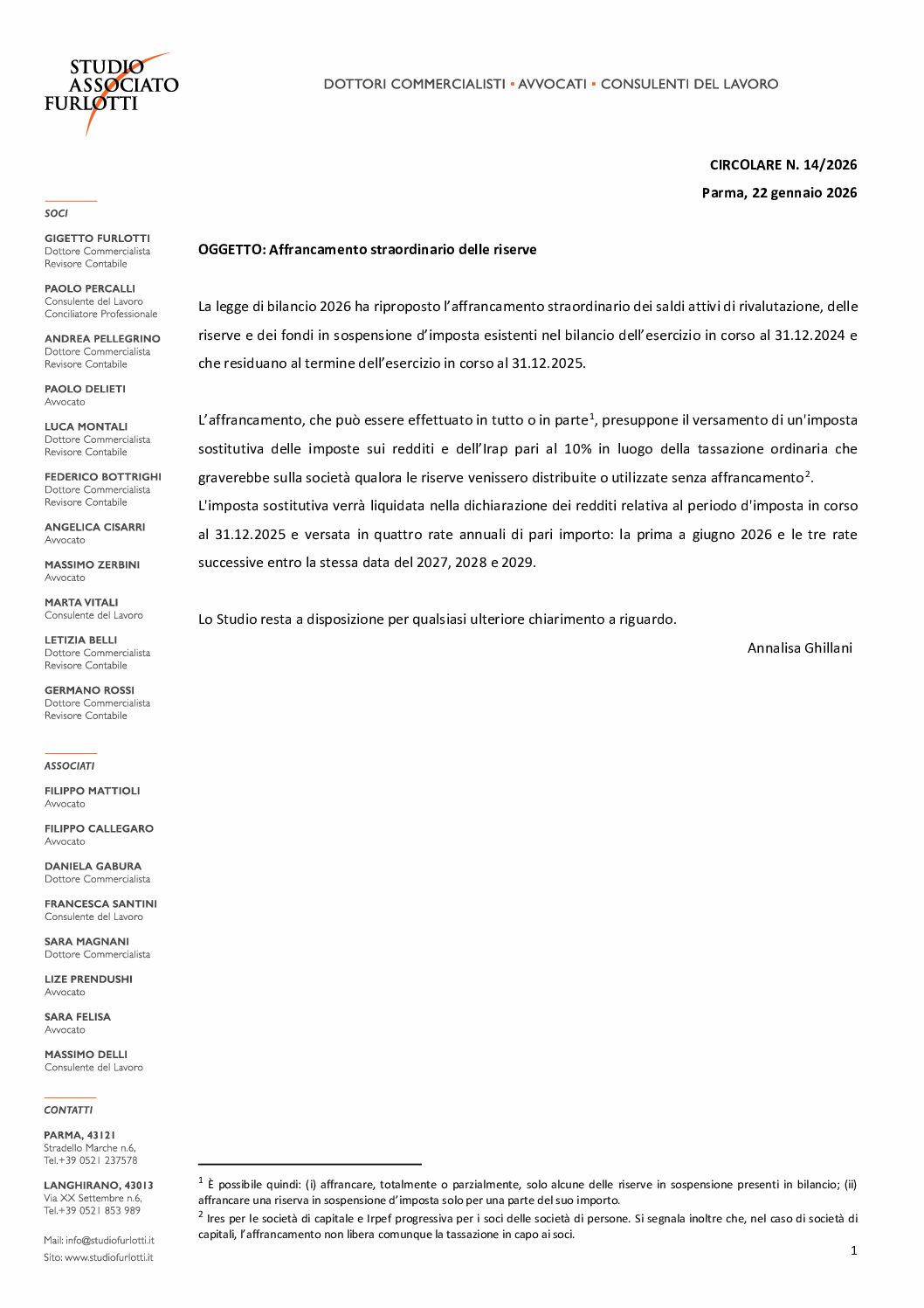 Circolare 2026.14 – Affrancamento straordinario delle riserve