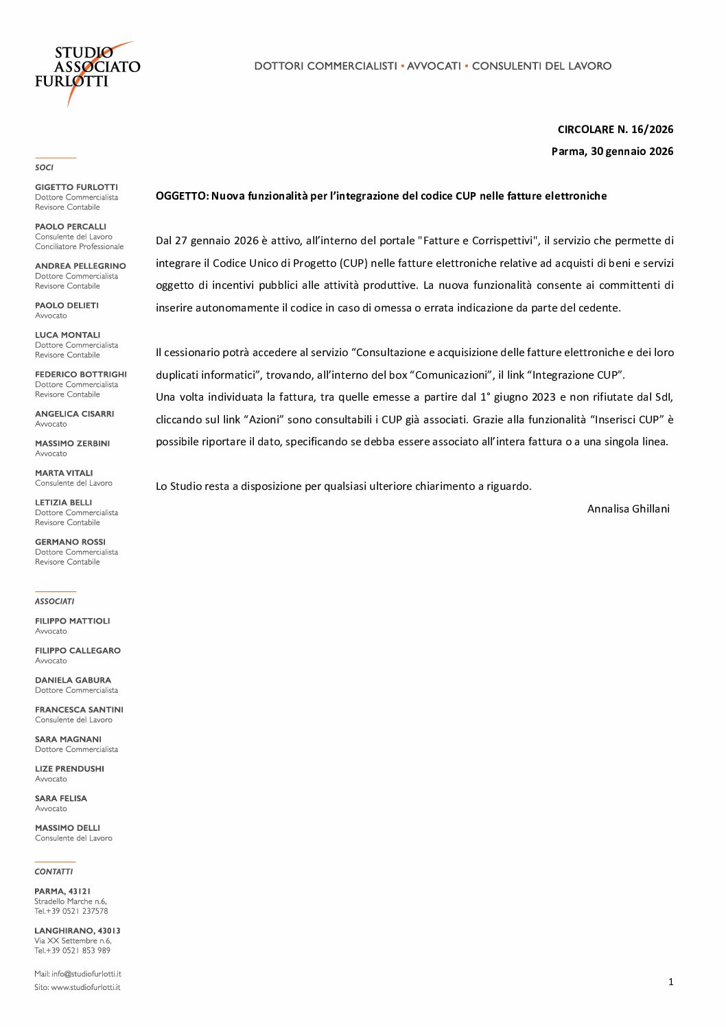 Circolare 2026.16 – Nuova funzionalità per l’integrazione del codice CUP nelle fatture elettroniche