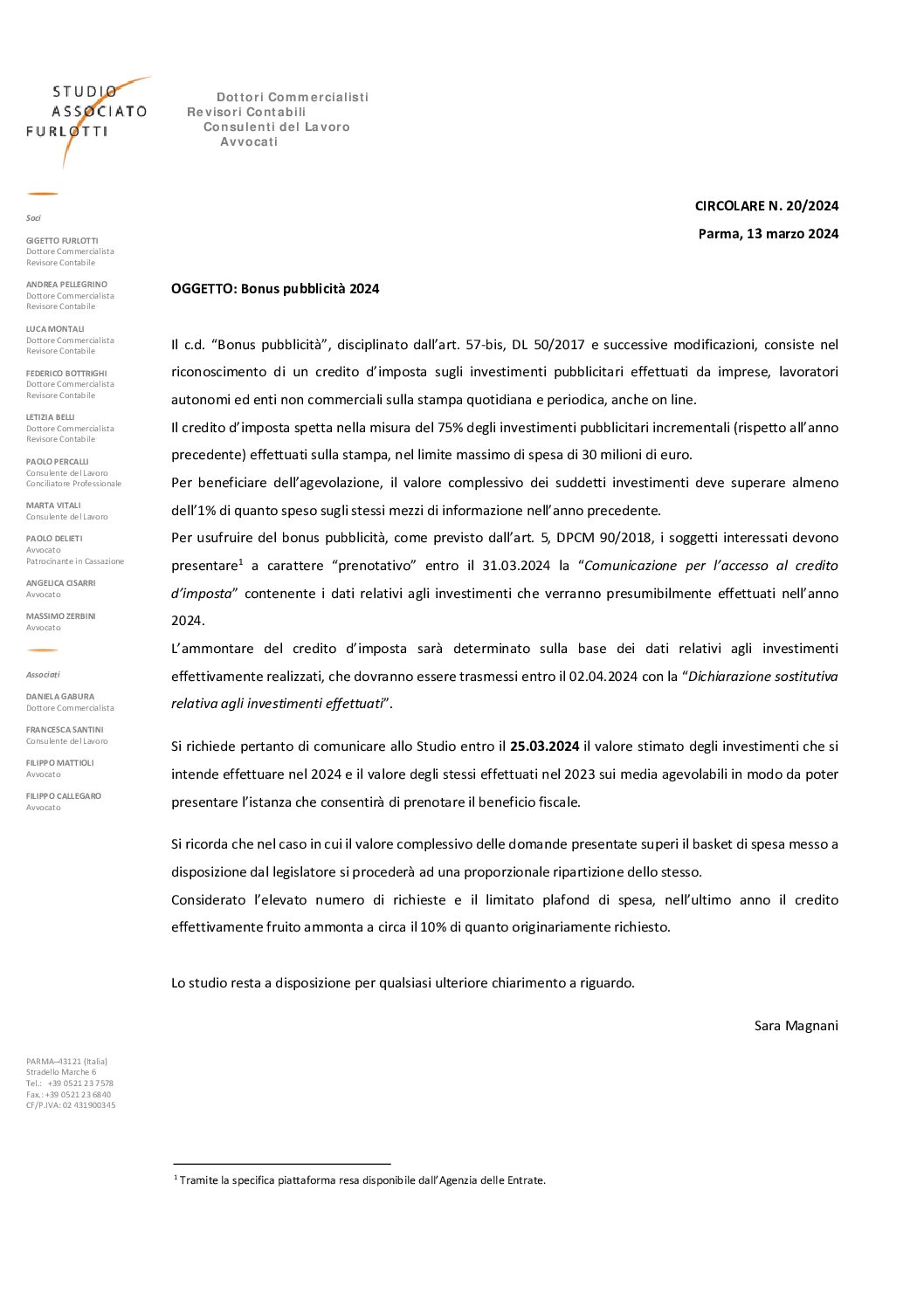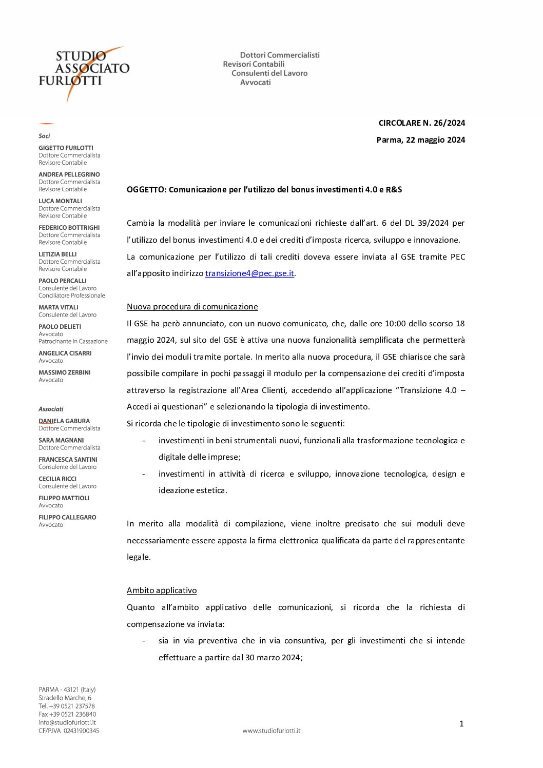 2024.26 Comunicazione per l’utilizzo del bonus investimenti 4.0 e RS