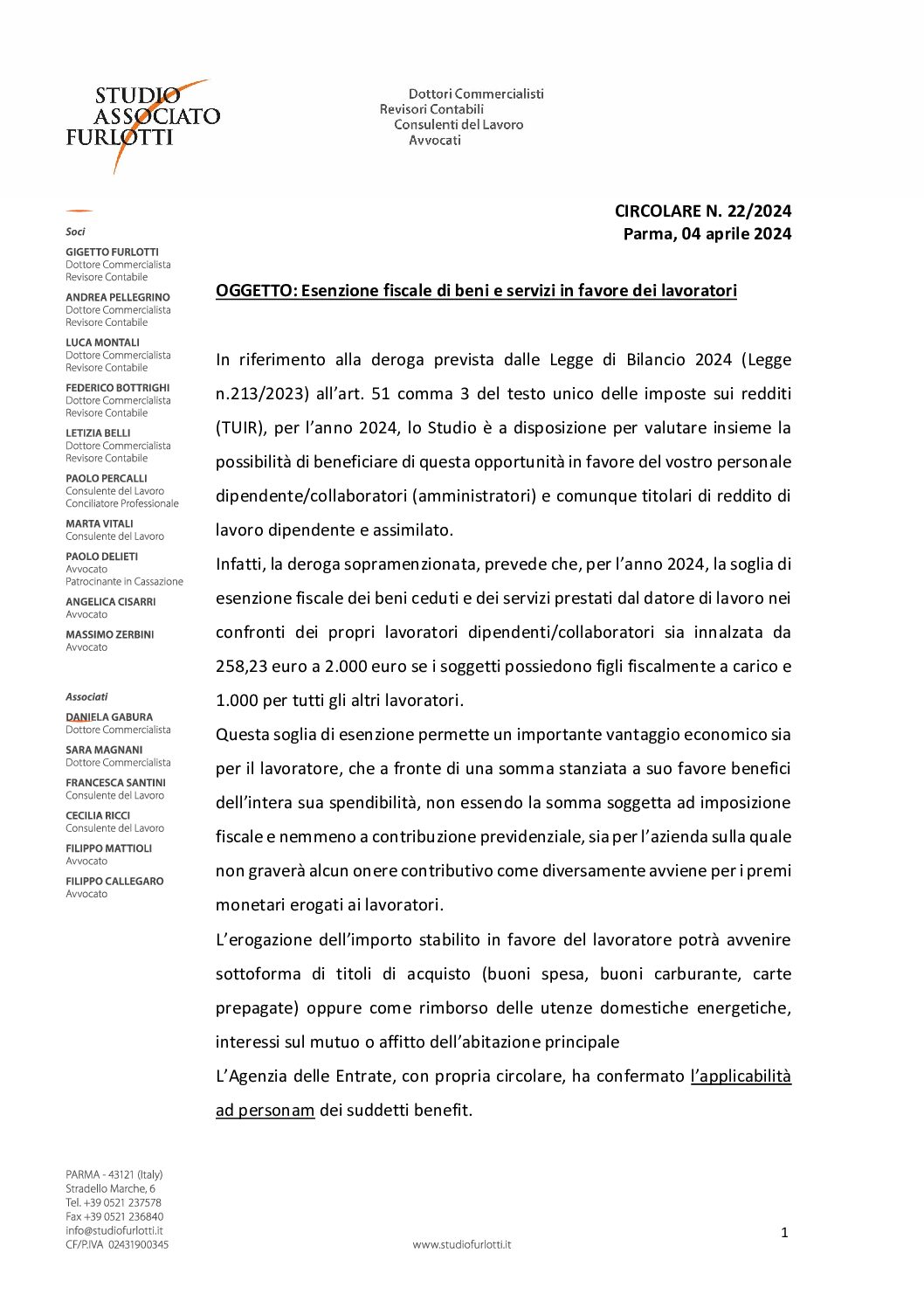 2024.22 Esenzione fiscale di beni e servizi in favore dei lavoratori
