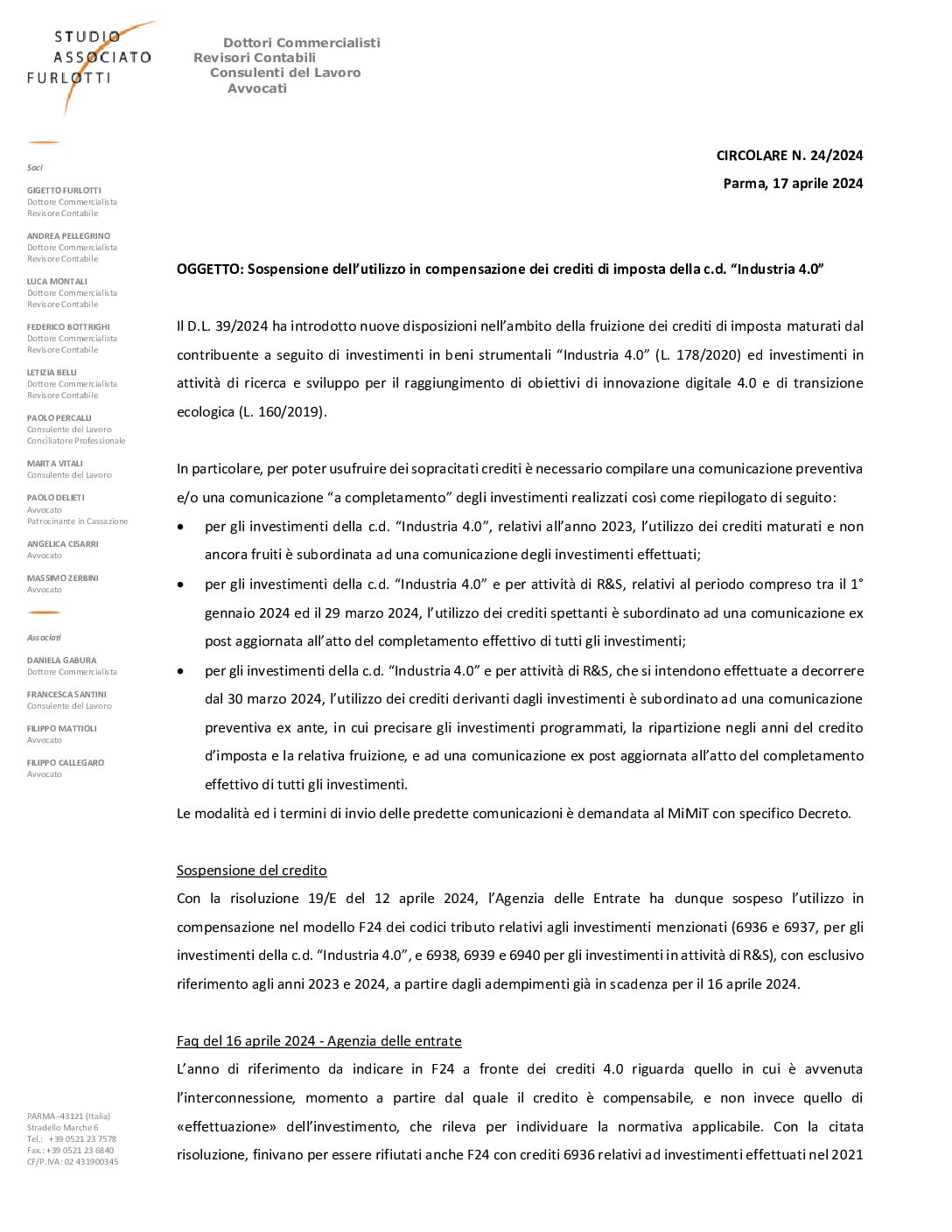 2024.24 Sospensione utilizzo compensazione crediti di imposta Industria 4.0 e RS