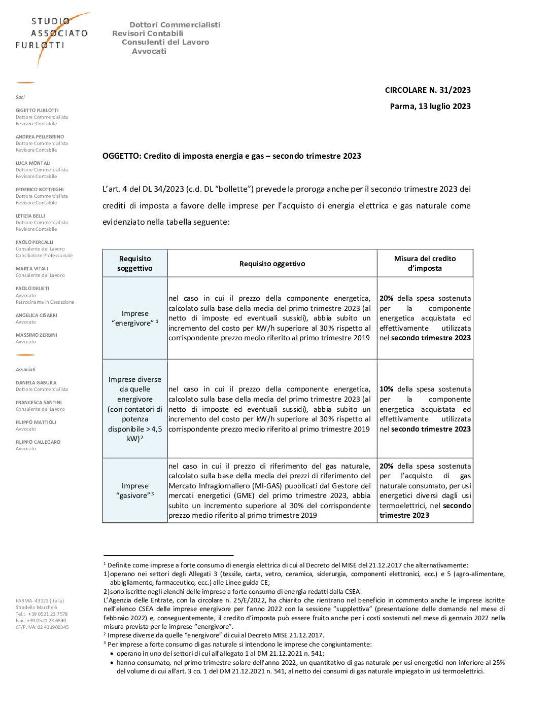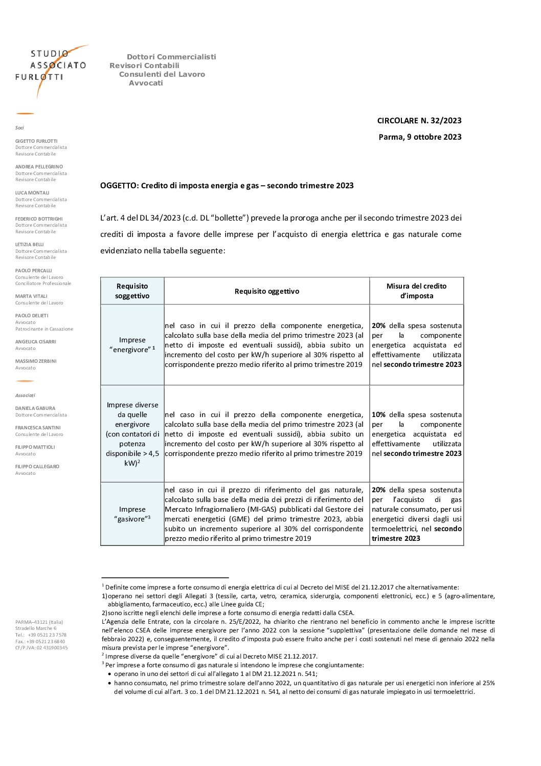 2023.32 Credito di imposta energia e gas secondo trimestre 2023 1