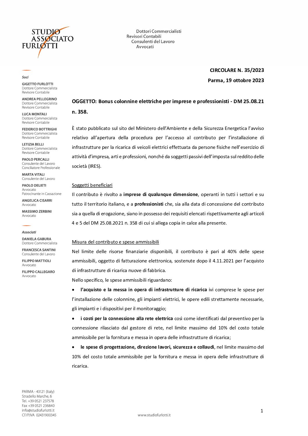 2023.35 Bonus colonnine elettriche per imprese e professionisti DM 25 agosto 2021 n. 358